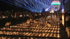 The lamps were lit in the northern Indian temple town of Ayodhya, Uttar Pradesh, on Sunday ahead of Diwali, the Hindu festival of lights.